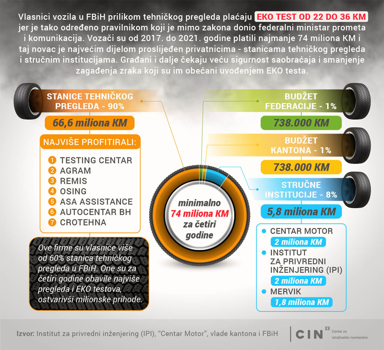 Prema podacima koje je prikupio CIN, u budžete FBiH i budžete deset kantona godišnje se od EKO testova uplati u prosjeku 350 hiljada KM. Ostatak od 18,5 miliona KM se dijeli na tri stručne institucije i stanice tehničkog pregleda, u skladu sa brojem obavljenih EKO testova.